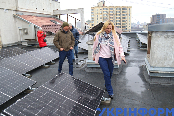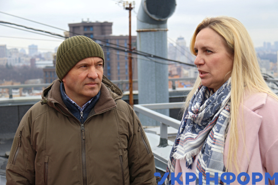 Заступник голови КМДА Петро Пантелеєв разом із головою правління ОСББ "Сусіди, Чорновола-20" Тетяною Костенко на даху енергостійкого житлового будинку на вул. В’ячеслава Чорновола, 20, де за кошти співвласників було встановлено гібридну сонячну електростанцію, завдяки якій забезпечується робота насосів водопостачання, теплопостачання, освітлення місць загального користування, системи контролю доступу та одного ліфта в кожній секції, Київ, 19 березня 2025 року.