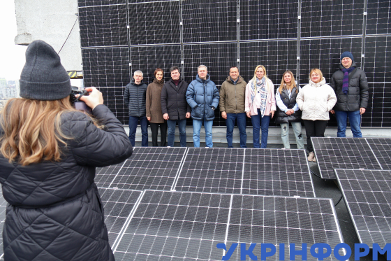 Заступник голови КМДА Петро Пантелеєв разом із головою правління ОСББ "Сусіди, Чорновола-20" Тетяною Костенко (у центрі зліва направо) позують для фото на даху енергостійкого житлового будинку на вул. В’ячеслава Чорновола, 20, де за кошти співвласників було встановлено гібридну сонячну електростанцію, завдяки якій забезпечується робота насосів водопостачання, теплопостачання, освітлення місць загального користування, системи контролю доступу та одного ліфта в кожній секції, Київ, 19 березня 2025 року.