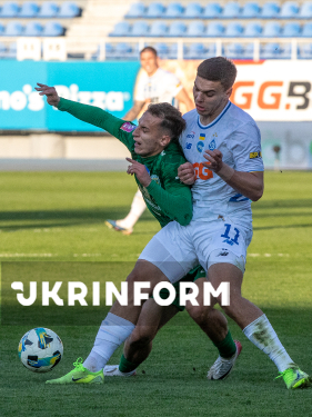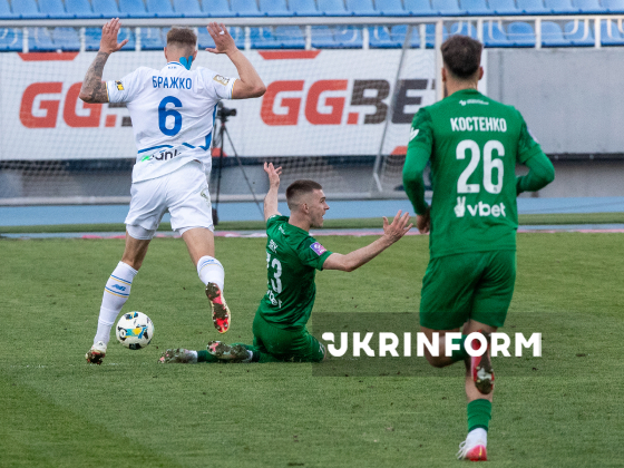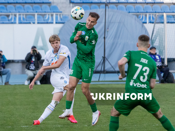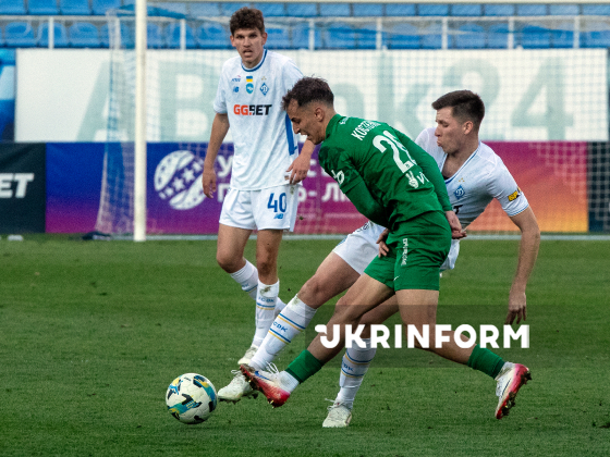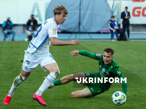 Захисник ФК “Динамо” Максим Коробов, півзахисник ФК “Карпати” Ян Костенко (зліва направо) борються за м`яч під час матчу 22-туру чемпіонату України з футболу серед команд Прем`єр-ліги між ФК “Динамо” (Київ) і ФК “Карпати” (Львів), що завершився з рахунком 0:1 на користь львів`ян, на стадіоні “Динамо” імені Валерія Лобановського, Київ, 4 квітня 2026 року.