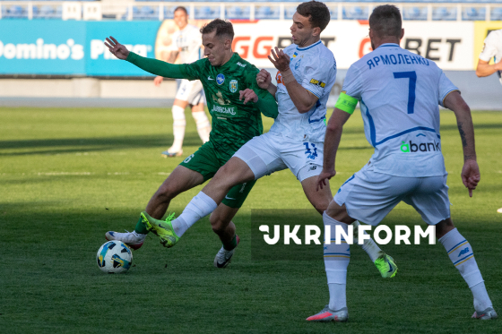 Півзахисник ФК “Динамо” Володимир Бражко, захисник ФК “Карпати” Ростислав Лях, півзахисник ФК “Карпати” Ян Костенко (зліва направо) борються за м`яч під час матчу 22-туру чемпіонату України з футболу серед команд Прем`єр-ліги між ФК “Динамо” (Київ) і ФК “Карпати” (Львів), що завершився з рахунком 0:1 на користь львів`ян, на стадіоні “Динамо” імені Валерія Лобановського, Київ, 4 квітня 2026 року.