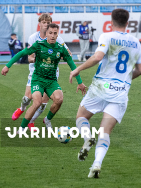 Півзахисник ФК “Карпати” Ян Костенко та півзахисник ФК “Динамо” Олександр Піхальонок борються за м`яч під час матчу 22-туру чемпіонату України з футболу серед команд Прем`єр-ліги між ФК “Динамо” (Київ) і ФК “Карпати” (Львів), що завершився з рахунком 0:1 на користь львів`ян, на стадіоні “Динамо” імені Валерія Лобановського, Київ, 4 квітня 2026 року.