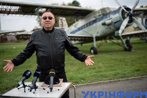 Президент Асоціації розвитку авіації України (АРАУ) Олександр Бадрудінов бере участь у пресконференції, присвяченій надходженню до державної частини Музейного фонду України єдиного збереженого в світі екземпляра літака Ан-6 та раритетного літака Ан-2П, на території тимчасово закритого для відвідувачів Державного музею авіації ім. О. К. Антонова, Київ, 7 жовтня 2025 року.