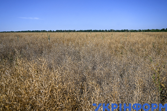 Комбайн працює на полі сільсько-виробничого господарства “Жоржович” під час збирання врожаю озимого ріпака, Запорізька область, 11 липня 2024 року.