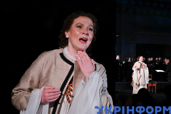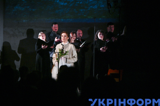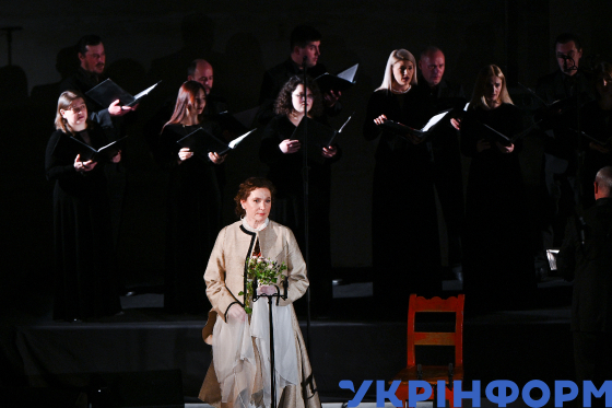 Авторка ідеї проєкту та режисерка, актриса, співачка, лауреатка Національної премії ім. Т. Шевченка, заслужена артистка України Наталія Половинка під час співочої дії “Цвіт”, створеної Театральним центром “Слово і голос" у співпраці з мистецьким простором LEM, до дня народження Тараса Шевченка, Львів, 8 березня 2025 року.