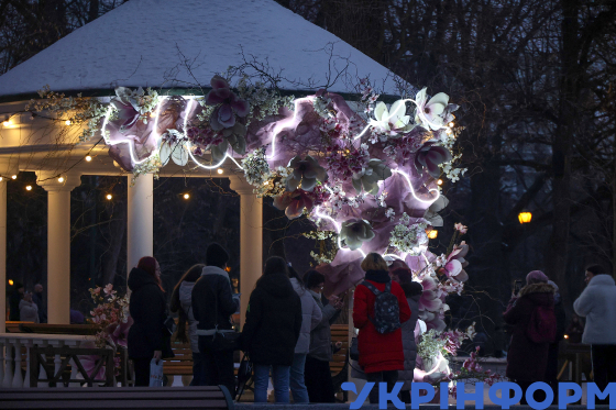 Альтанка, прикрашена квітковою інсталяцією, Харків, 4 березня 2026 року. Харків готується до весняних свят, місто прикрашають квітковими декораціями та тематичними інсталяціями.