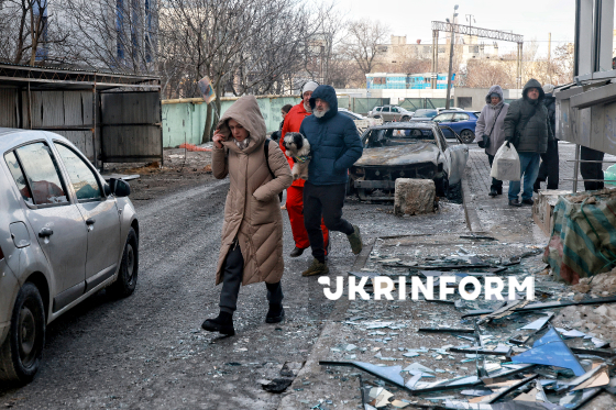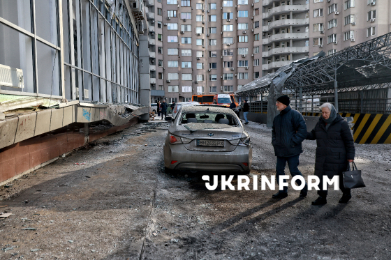 Чоловік і жінка проходять повз понівечений внаслідок російського обстрілу БпЛА у автомобіль у житловому секторі Одеси, 9 лютого 2026 року.