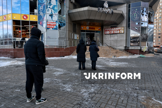 Місцеві жителі проходять повз вирвані вибуховою хвилею віконні рами та розбите скло на території житлового будинку, пошкодженого внаслідок російського обстрілу БпЛА, у житловому секторі Одеси, 9 лютого 2026 року.