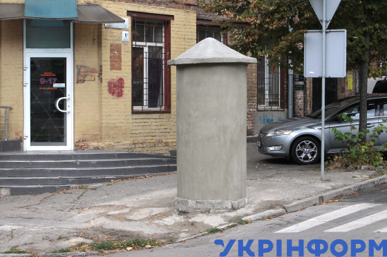 Нова афішна тумба, встановлена на місці демонтованої комунальними службами історичної конструкції 1855-го року, на розі вулиць Паторжинського та Моссаковського, Дніпро, 4 серпня 2025 року.