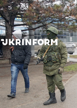 Озброєний чоловік у камуфляжі без розпізнавальних знаків стоїть на прилеглій території військової частини 36-ї окремої бригади берегової оборони Військово-морських Сил України в смт Перевальне, Сімферопольський район, АР Крим, 2 березня 2014 року. Фото Сергія Павліва.