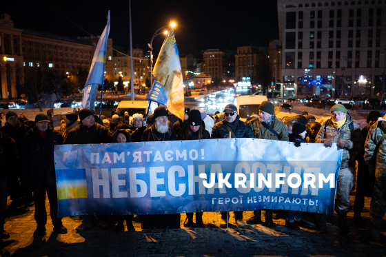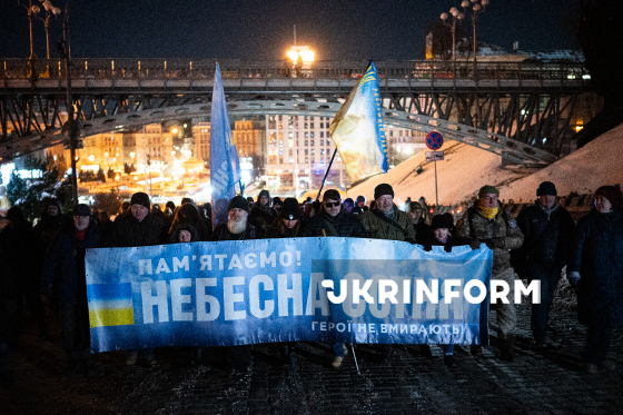Учасники ходи пам’яті, присвяченої Героям Небесної Сотні, несуть Алеєю Героїв Небесної Сотні банер із написом “Пам`ятаємо! Небесна Сотня! Герої не вмирають” у День пам`яті Героїв Небесної Сотні, Київ, 20 лютого 2026 року.