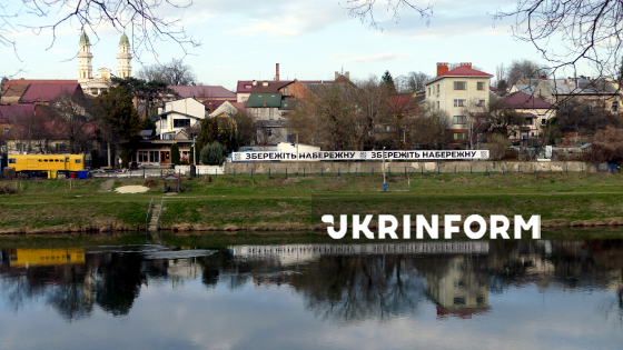 Банер із гаслом "Збережіть набережну" на набережній річки Уж, засміченої після паводка побутовим сміттям та сухостоєм, Ужгород, 12 березня 2026 року.