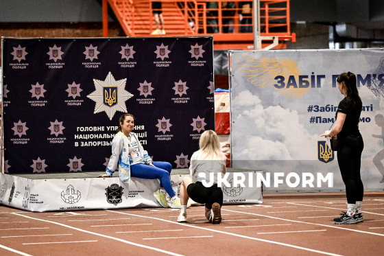 Учасники першого Всеукраїнського забігу пам’яті загиблих співробітників Національної поліції України фотографуються на тлі банера Національної поліції України, Запоріжжя, 7 березня 2026 року.