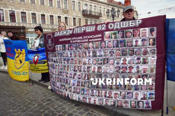 Учасники тримають банер і прапори під час акції-нагадування про військовополонених Маріупольського гарнізону, всіх полонених та зниклих безвісти захисників України “Не мовчи! Полон вбиває” на площі Петефі, Ужгород, 22 березня 2026 року.