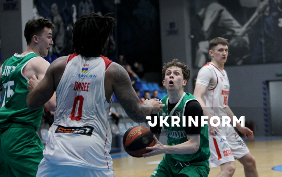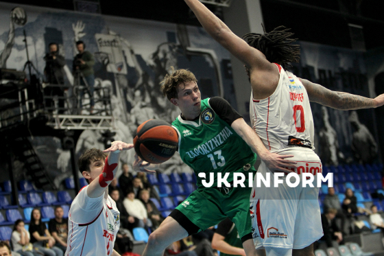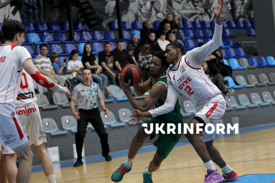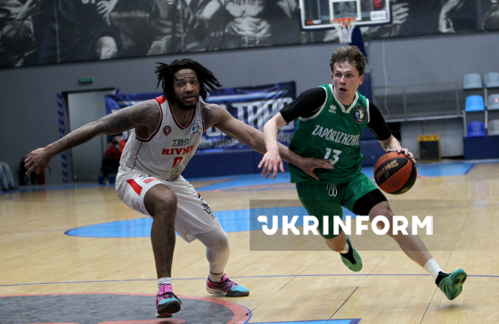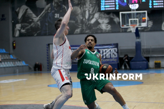 Ігровий момент матчу чемпіонату України з баскетболу серед команд Суперліги між БК “Запоріжжя” і БК “Рівне”, що завершився з рахунком 83:74 на користь запорізької команди, Дніпро, 29 березня 2026 року.