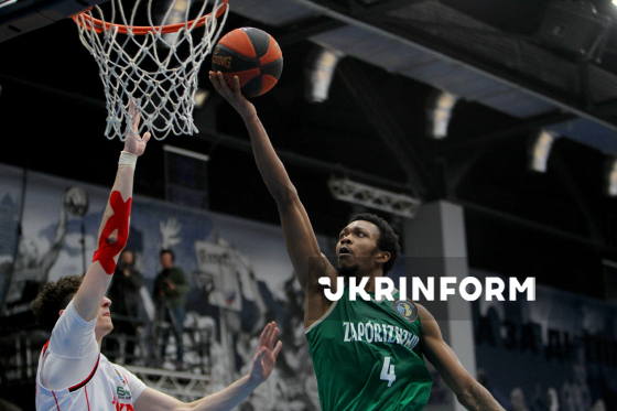 Гравець БК “Запоріжжя” Каліб Метьюз закидає м`яч у баскетбольне кільце під час матчу чемпіонату України з баскетболу серед команд Суперліги між БК “Запоріжжя” і БК “Рівне”, що завершився з рахунком 83:74 на користь запорізької команди, Дніпро, 29 березня 2026 року.