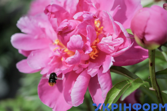 Бджола біля півонії у Національному ботанічному саду імені Миколи Гришка, Київ, 2 червня 2025 року.