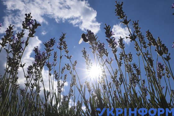 Бджола та оса запилюють лаванду на полі фермерського господарства “Лавандова гора” поблизу міста Перечин, Закарпатська область, 20 липня 2025 року.