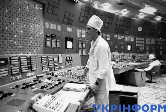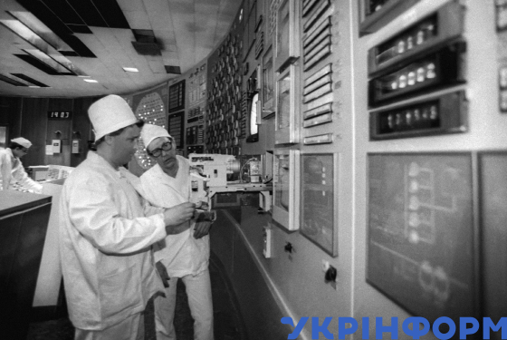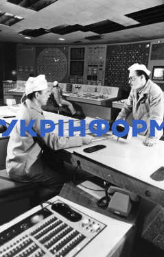 Працівники станції біля блочного щита управління №1 ЧАЕС, Чорнобиль, Київська область, квітень 1987 року. Фото Володимира Репіка та Володимира Самохоцького.