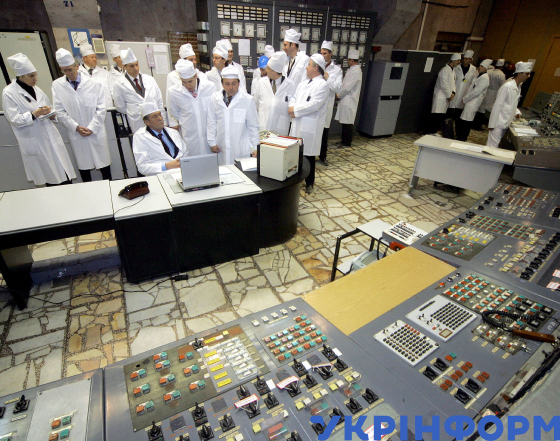 Президент України Віктор Ющенко (на першому плані ліворуч) спостерігає за вивантаженням відпрацьованого ядерного палива з реактора третього енергоблока Чорнобильської АЕС, Чорнобиль, Київська область, 8 грудня 2005 року. Фото Миколи Лазаренка.