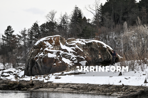 Чоловік стоїть біля засніженої кам`яної брили на острові Хортиця, 2 січня 2026 року.