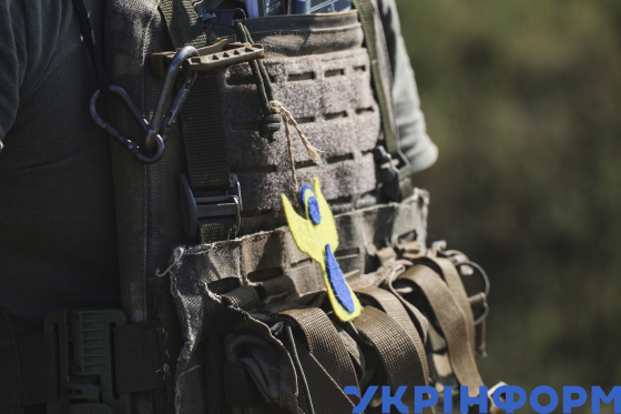 Синьо-жовтий ангелик на бронежилеті бійця розрахунку БМ-21 "Град" 30-ї окремої механізованої бригади імені князя Костянтина Острозького, який виконує бойове завдання на Донецькому напрямку, 3 червня 2025 року.