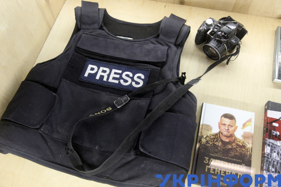 Буклети та бронежилети під час відкриття фотовиставки на підтримку полонених журналістів до Міжнародного дня боротьби з безкарністю за злочини проти журналістів, що складається з 10 фотокартин Євгена Зінченка, на території Національної спілки журналістів України, Київ, 4 листопада 2024 року.