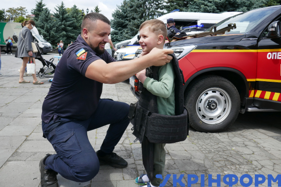 Піротехнік ДСНС надягає на дитину бронежилет під час розважально-повчального заходу, організованого за ініціативи благодійної організації “ЯМаріуполь”, на Київській набережній в Ужгороді, 31 травня 2025 року.