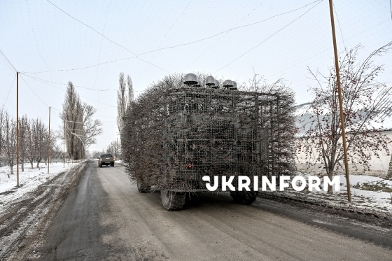 Військовий броньований автомобіль, обладнаний антидроновою решіткою, їде дорогою, захищеною від атак російських FPV-дронів антидроновою сіткою, Донецька область, 23 січня 2026 року.
