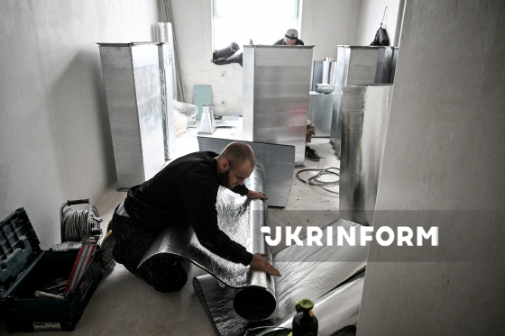 Будівельники працюють на будівництві нового хірургічного корпусу Запорізької обласної дитячої лікарні, Запоріжжя, 19 лютого 2026 року. Саму будівлю вже зведено. Виконуються роботи з утеплення фасаду, а також внутрішні роботи. На спеціальному підземному поверсі буде укриття з повноцінною сучасною операційною та палатами інтенсивної терапії, на першому - приймальне та діагностичне відділення. На другому - хірургічне відділення на 25 ліжок, на третьому - три операційні та відділення інтенсивної терапії.