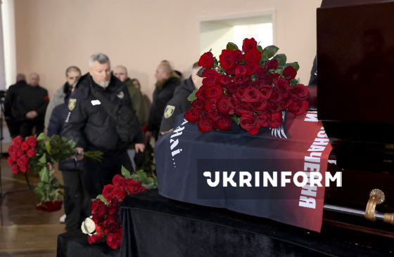 Під час церемонії прощання із 39-річним поліцейським взводу №1 роти №3 батальйону №2 полку поліції особливого призначення ГУНП у Харківській області Романом Кравченком, який загинув 17 березня під час виконання бойового завдання на Харківщині, Харків, 21 березня 2025 року.