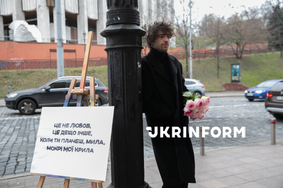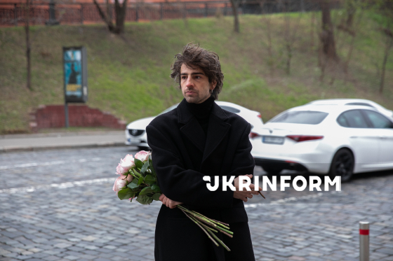 Співак, телеведучий, комік Володимир Дантес тримає у руці букет біло-рожевих троянд біля будівлі Національної філармонії України під час церемонії прощання з 38-річним лідером музичного гурту ADAM Михайлом Клименком, який помер 7 грудня після тритижневої коми та тривалого туберкульозного менінгіту, Київ, 9 грудня 2025 року.