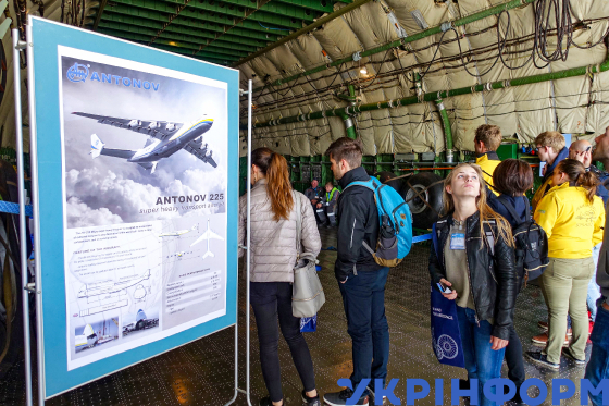 Відвідувачі авіасалону ILA-2018 біля рекламного щита у вантажному відсіку українського транспортного літака Ан-225 "Мрія", Берлін, Федеративна Республіка Німеччина, 25 квітня 2018 року. Фото Ольги Танасійчук.