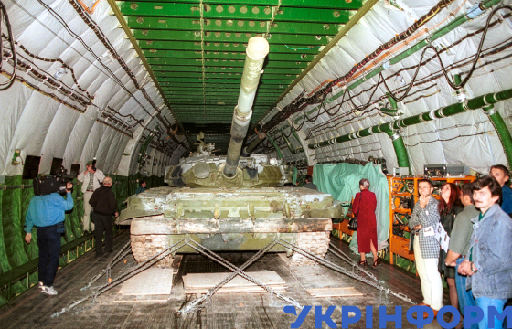 Військова техніка у вантажному відсіку під час підготовки транспортного літака Ан-225 "Мрія" до польоту за маршрутом "Київ-Чорне море-Київ" із рекордним вантажем на борту, Київ, 11 вересня 2001 року. Фото Сергія Кузнецова.