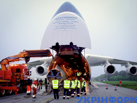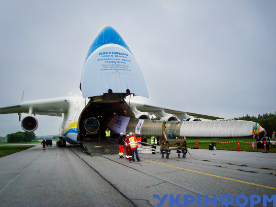 Лопать вітряка – найбільший моновантаж із Китаю вивантажують із вантажного відсіку українського надважкого транспортного літака Ан-225 "Мрія" в аеропорту Vojens/Skrydstrup, Данія, 10 червня 2010 року. Фото з архіву Укрінформу.