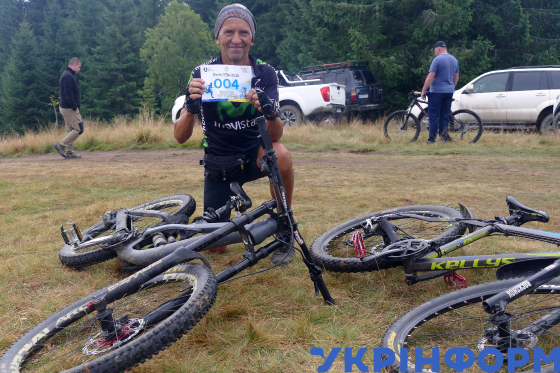 Учасник велозаїзду, організованого у межах відкриття першої ділянки нового туристичного веломаршруту "Вело ЗТШ", показує номер, Закарпатська область, 31 серпня 2025 року.