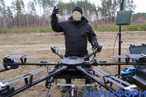 Представник компанії DronariumAir під час презентації мультикоптера (дрономатки), що відбулася у рамках демонстрації бойового використання волоконно-оптичної системи керування FPV-дронами, Київська область, 29 січня 2025 року.