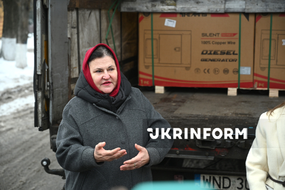 Посол Європейського Союзу в Україні Катаріна Матернова відповідає на запитання журналістів під час передачі першої партії з 76 аварійних генераторів зі стратегічних резервів ЄС, що надійшла до столиці, Київ, 27 січня 2026 року. Загалом Україна отримає 447 генераторів для підтримки послуг з тепло- та водопостачання, зокрема у навчальних, соціальних та медичних закладах, укриттях і пунктах обігріву у столиці та прифронтових громадах, постраждалих після російських ударів по енергетичній інфраструктурі країни.
