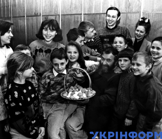 Друг київської організації "Діти Чорнобиля – за виживання", член асоціації допомоги чорнобильцям у Франції Жак Бастид (у центрі) із дітьми, які повернулись з оздоровлення у Франції, Київ, квітень 1995 року. Фото Володимира Самохоцького.