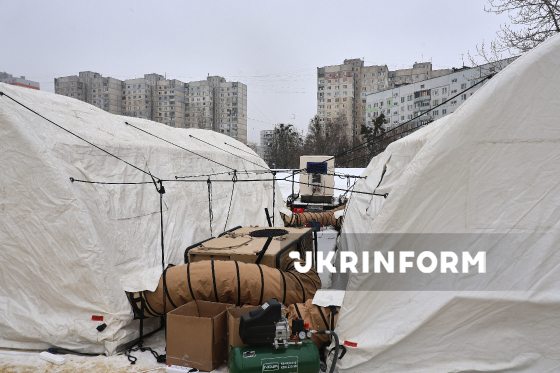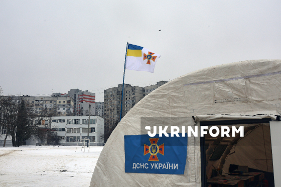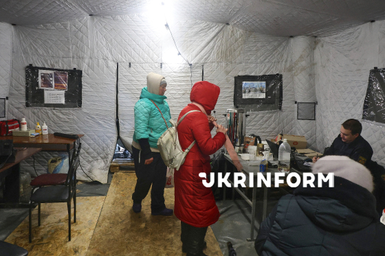 Мобільний пункт незламності ДСНС, розгорнутий через складну ситуацію з електро- та теплопостачанням, спричинену російськими атаками на енергооб`єкти України, Харків, 12 лютого 2026 року.