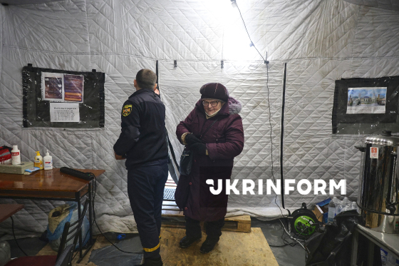 Жінка гріється у мобільному пункті незламності ДСНС, розгорнутому через складну ситуацію з електро- та теплопостачанням, спричинену російськими атаками на енергооб`єкти України, Харків, 12 лютого 2026 року.