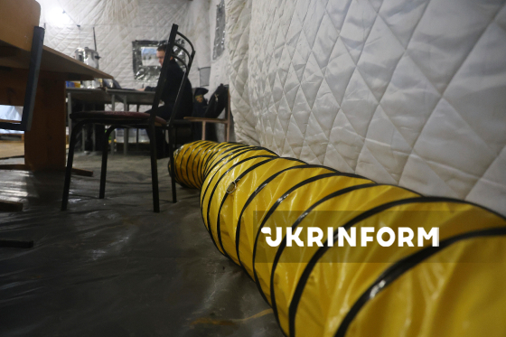 Повітропровід у мобільному пункті незламності ДСНС, розгорнутому через складну ситуацію з електро- та теплопостачанням, спричинену російськими атаками на енергооб`єкти України, Харків, 12 лютого 2026 року.