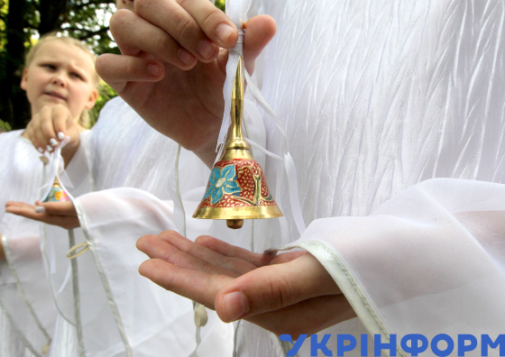 Старшокласник несе на плечі першокласницю зі шкільним дзвоником під час урочистої лінійки з нагоди свята Першого дзвоника у Вишнівському ліцеї “Ідеал”, Вишневе, Київська область, 1 вересня 2025 року.