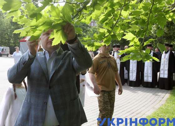 Голова Дніпропетровської обласної ради Микола Лукашук прив’язує до дерева символічний дзвіночок під час церемонії вшанування пам’яті дітей, які загинули внаслідок збройної агресії РФ проти України, у сквері Героїв, Дніпро, 4 червня 2025 року.
