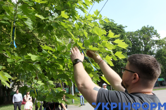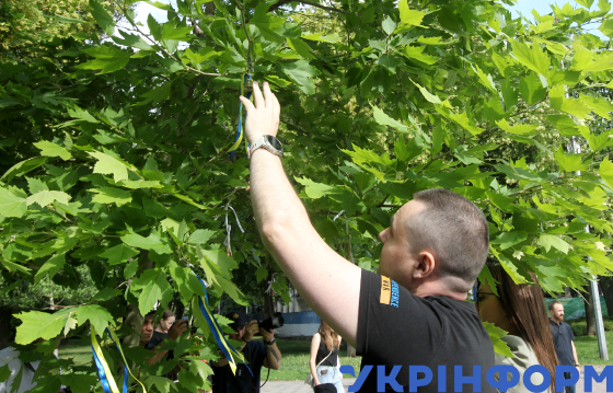 Учасник церемонії вшанування пам’яті дітей, які загинули внаслідок збройної агресії РФ проти України, прив’язує до дерева символічний дзвіночок у сквері Героїв, Дніпро, 4 червня 2025 року.