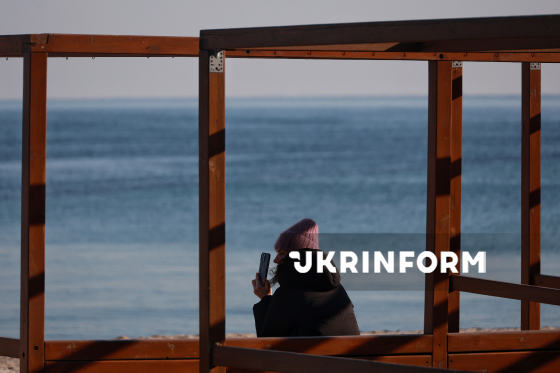 Жінка з телефоном відпочиває на одному із міських пляжів у зимовий морозний день, Одеса, 12 січня 2026 року.