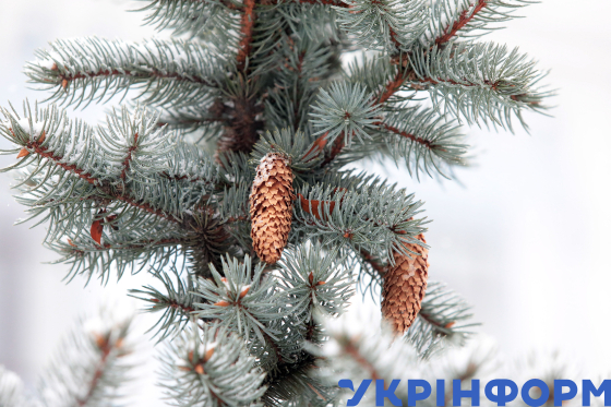 Шишки на засніжених гілках блакитної ялини, Київ, 12 грудня 2018 року.