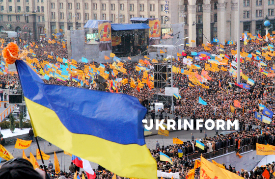 Тисячі киян і гостей столиці прибули на Майдан Незалежності на громадську інавгурацію переможця президентських виборчих перегонів Віктора Ющенка, який виступив на центральній площі міста зі зверненням до народу після офіційної інавгурації у Верховній Раді України, Київ, 23 січня 2005 року. Фото Юрія Рильчука.
