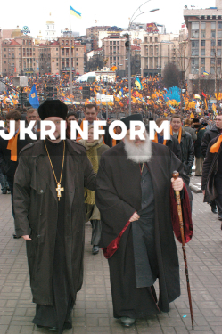 Глава Української греко-католицької церкви (УГКЦ) кардинал Любомир Гузар (праворуч ) під час громадської інавгурації новообраного Президента України Віктора Ющенка на Майдані Незалежності, Київ, 23 січня 2005 року. Фото Юрія Рильчука.