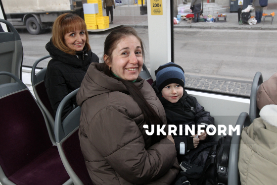 Пасажири заходять у салон нового низькопідлогового трамваю, що курсує на маршруті №1, Дніпро, 4 березня 2026 року. Вагони обладнані відкидним пандусом, широкими проходами та місцями для крісел колісних. У салоні - звукові оповіщення, таблички зі шрифтом Брайля та кнопки сигналу водієві. Загалом місто закупило п’ять таких трамваїв.