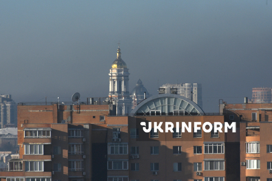 Велика лаврська дзвіниця та житловий будинок, оповиті сірим димом від масштабної пожежі, що виникла у складському приміщенні в Солом`янському районі міста, Київ, 5 січня 2026 року.